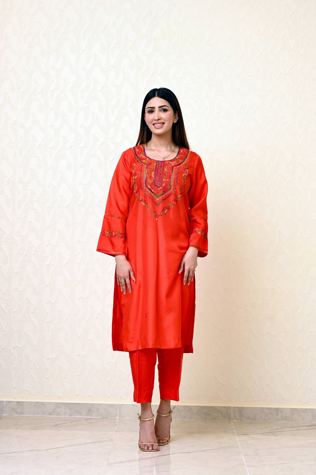 This Chinese embossed silk suit is pure elegance. It features heavy embroidery on the neck and sleeves, giving it a rich, graceful look. The outfit comes with a pure chiffon tie-dye dupatta, adding a soft and colorful touch to the overall design.