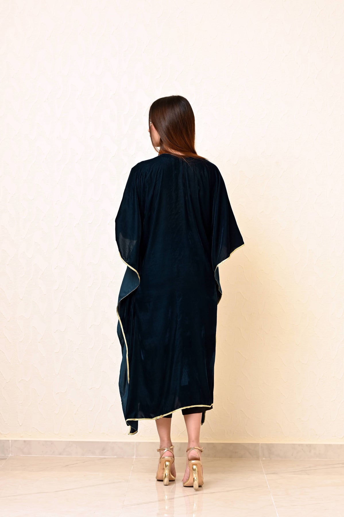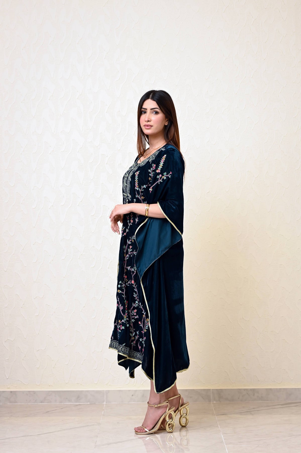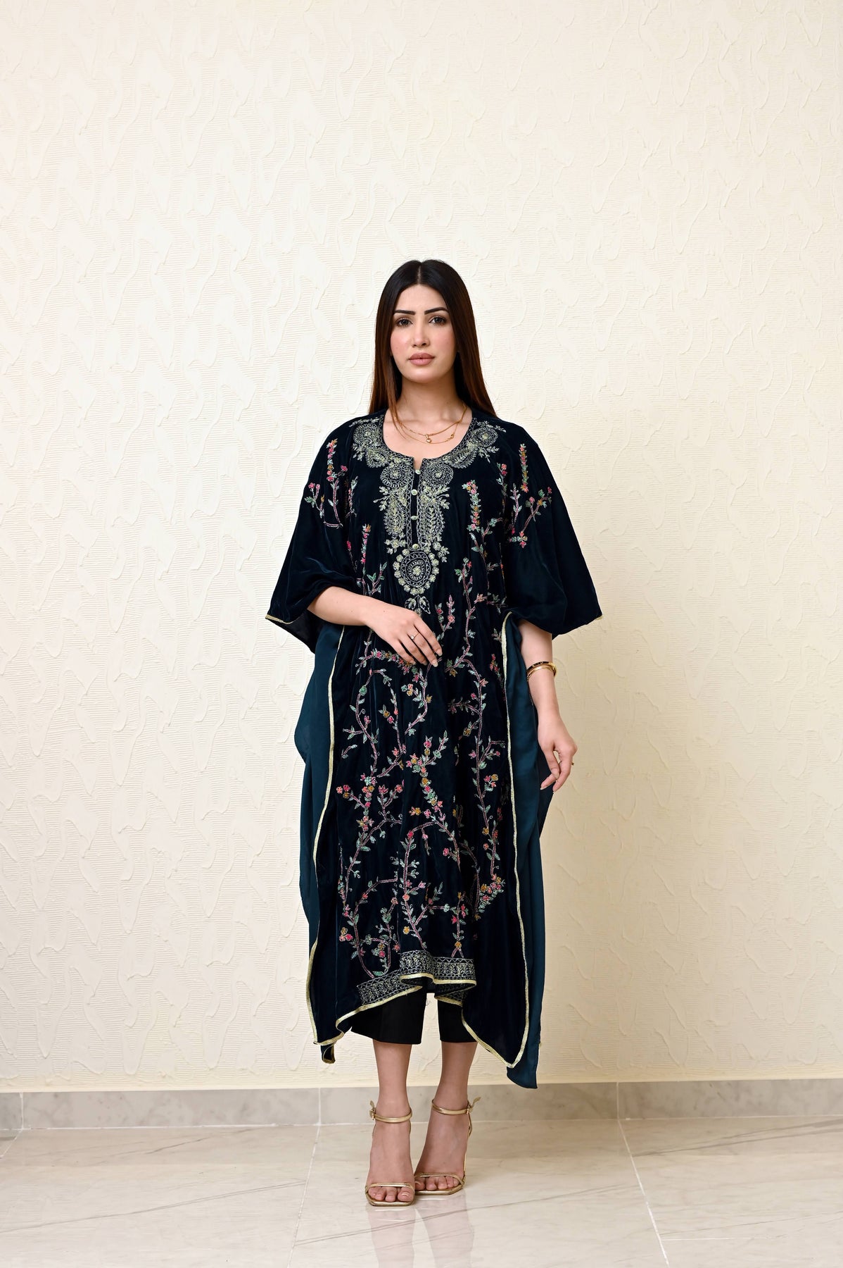This moss green velvet kaftan is a perfect mix of elegance and comfort. It features beautiful full jaal Kashmiri embroidery, giving it a rich and graceful look. The soft velvet fabric drapes beautifully, making it ideal for festive gatherings or evening events.