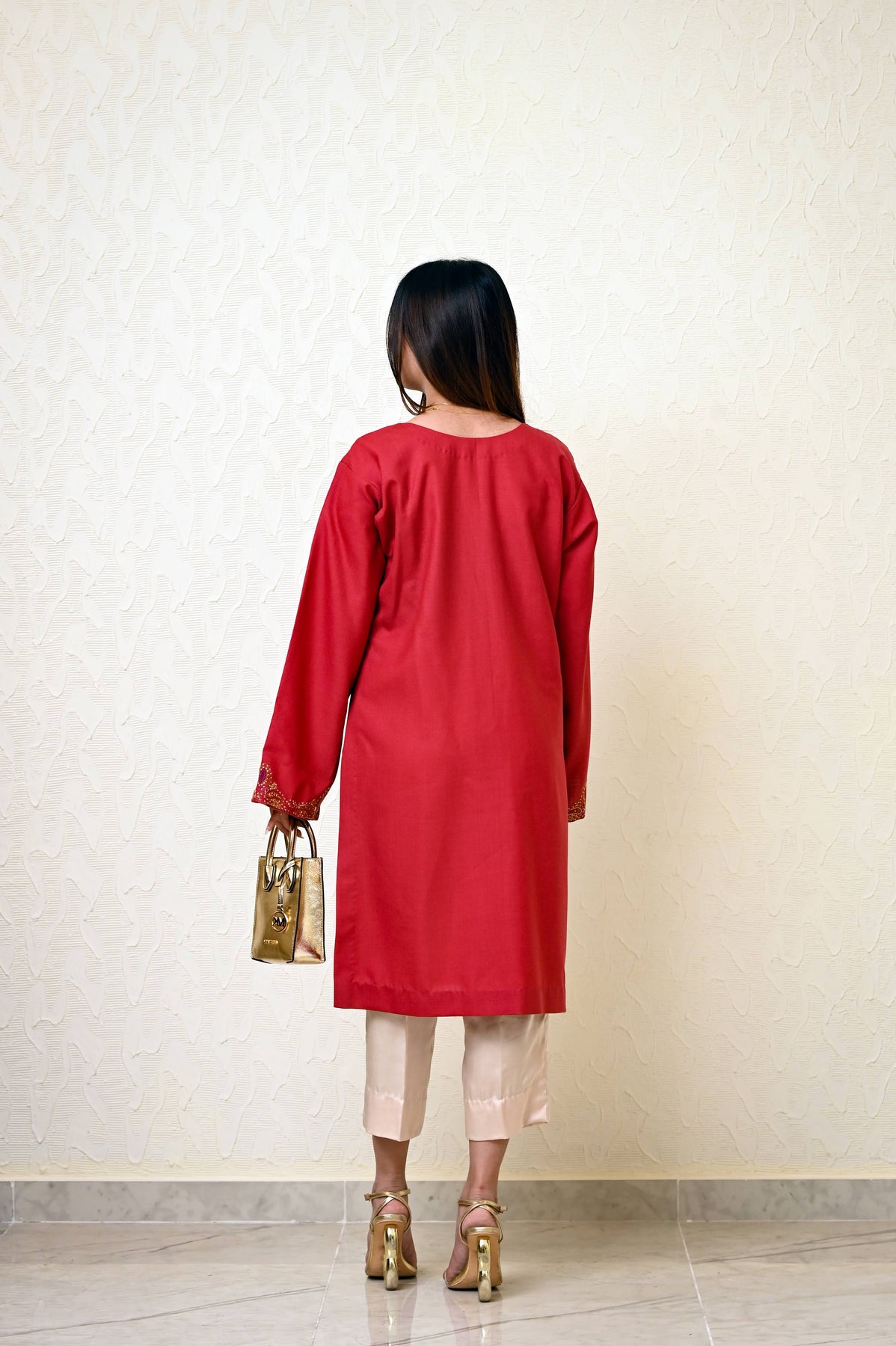 This rust-colored Marina feran is a cozy and elegant piece with beautiful heavy Kashmiri embroidery on the neckline. The soft fabric feels warm and comfortable, perfect for cooler days while keeping your style classy and traditional.